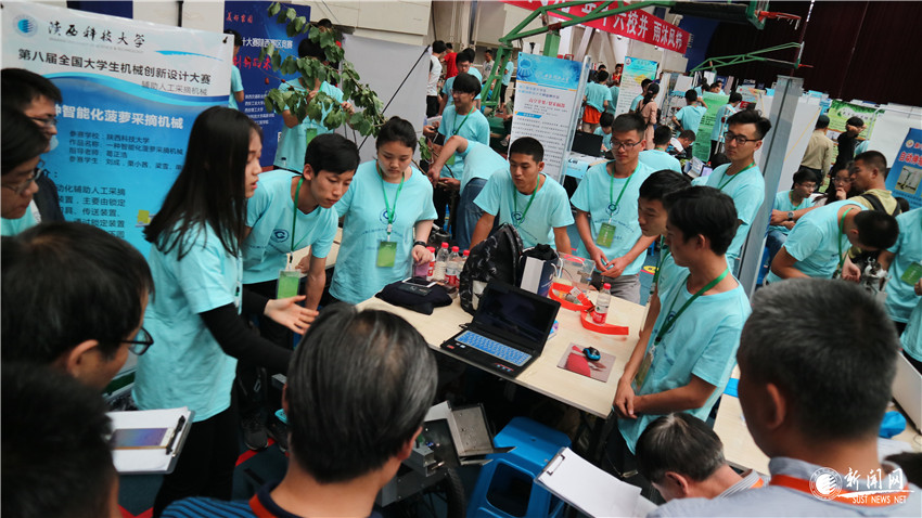 评委对我校作品“一种智能化菠萝采摘机械”进行现场问辩