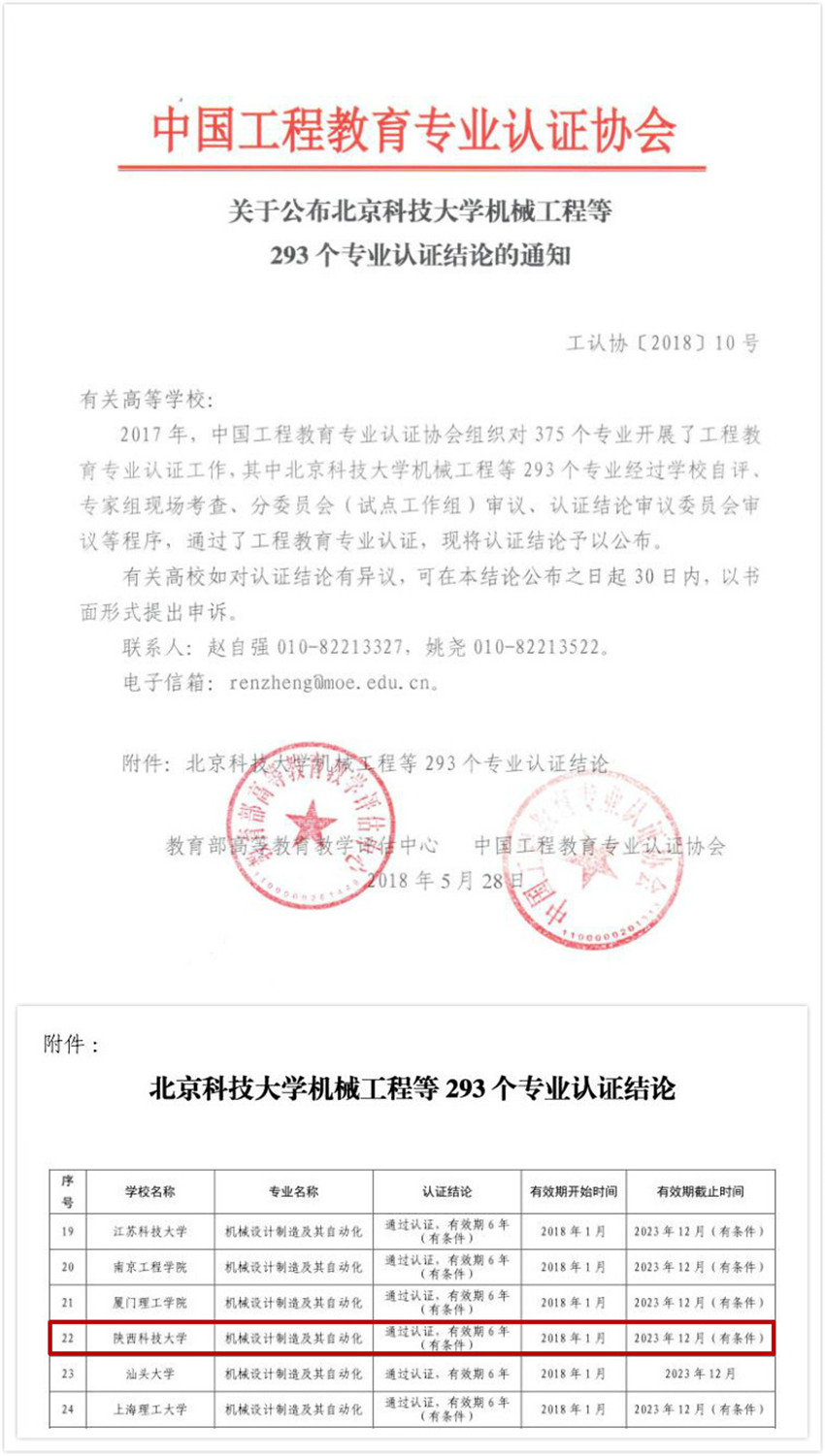 近日,教育部高等教育教学评估中心和中国工程教育专业认证协会联合发布了《关于公布北京科技大学机械工程等293个专业认证结论的通知》(工认协〔2018〕10号),公布了2017年参加全国工程教育专业认证的认证结论,经过学校自评、专家组现场考查、分委员会(试点工作组)审议、认证结论审议委员会审议等程序,全国高校共有293个专业通过认证。我校机械设计制造及其自动化专业名列其中,顺利通过中国工程教育专业认证,有效期为6年(有条件),即2018年1月至2023年12月。此前,机械设计制造及其自动化专业于2017年11月6日至8日接受了工程教育专业认证专家组现场考查。至此,我校已有包括无机非金属材料工程、食品科学与工程、化学工程与工艺、机械设计制造及其自动化在内的四个专业通过工程教育专业认证。