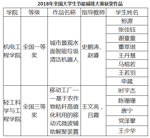 本届大赛起点高、规模大、精品多、覆盖面广,我省仅有西安交通大学,西北工业大学,陕西科技大学三所高校入围全国总决赛。经过校级初评,校级答辩,国赛网评,国赛会评,作品展示,终审答辩等环节的层层筛选,激烈角逐,由史鹏涛,赵睿老师指导的作品《城市景观水面智能垃圾清洁机器人》从全国3881件参赛作品中脱颖而出,获得国家级一等奖(获奖率仅为2.16%)的优异成绩。教育部高等学校能源动力类专业教学指导委员会主任、中国科学院院士何雅玲在参观我校学生作品展示时表示:该作品针对实际问题,创新性强,具有广阔的应用前景。