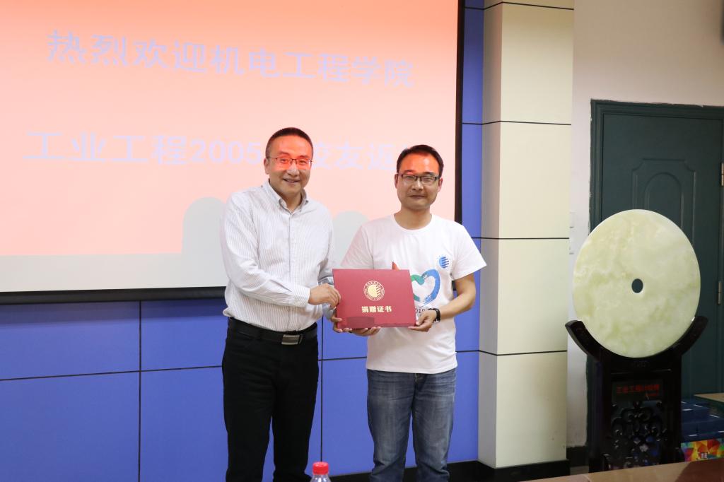 88858cc永利官网书记夏祥林向校友代表李龙颁发捐赠证书