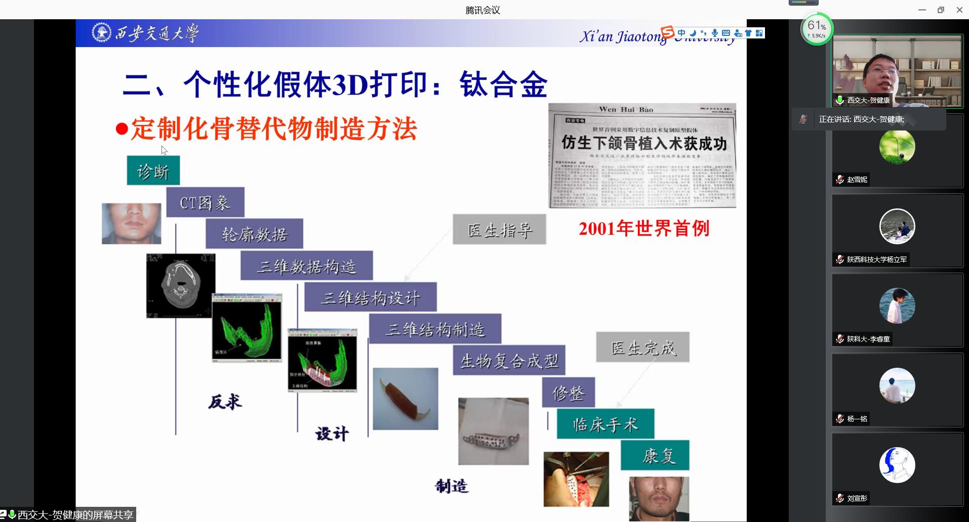 贺健康从3D打印的医学应用、个性化假体3D打印、可降解支架3D打印、微纳生物3D打印四个方面,讲解了国内外生物3D打印领域的研究前沿和发展动态。对相关研究方向在申请国家自然科学基金时如何紧跟国内外生物3D打印领域前沿、独辟蹊径、深挖科学问题提供了建设性的思路。通过他们团队科研成果落地医院临床应用的大量实例,讲述了科学家、医生、工程师如何成功合作,服务人类健康,挽救患者生命及提高人民生活质量,贡献生物3D打印科研人员的力量。对我校生物3D打印研究服务陕西地方经济,加快装备与产品产业化应用带来了宝贵经验。最后,贺健康在3D打印与临床医学结合、假体制造、支架与活性器官制造宏微结构一体化、3D打印技术等医工交叉领域如何创新性地开展科研给出了可操作性的建议。报告不仅对学院生物3D打印领域技术研究具有重要的借鉴和指导意义,同时对学院仿生制造技术与理论学科方向发展及博士点建设具有重要的促进作用。