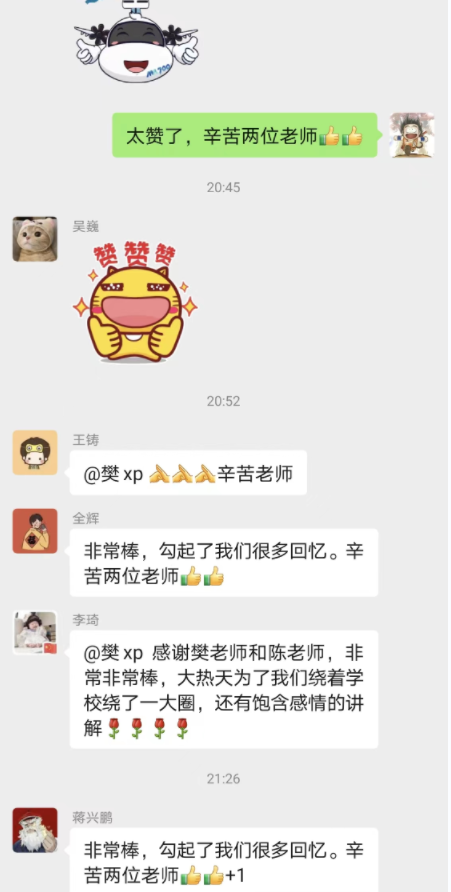 关心校友、汇聚校友资源、支持校友成长是学院一直在努力做的事情,学院成型教研室樊小蒲、田普建,办公室陈娅萍3位老师代表学院对校友云返校活动表示欢迎,对长期以来校友给予学院事业发展的关心、支持和帮助表示感谢,并向校友通报了学院发展近况及取得的突出成绩,希望校友们通过此次云返校活动与母校紧密团结起来,期待在疫情过后与大家缘聚科大,共叙师生情、同窗谊。