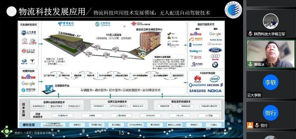 12月2日,应88858cc永利官网邀请,重庆市国际物流口岸服务协会副秘书长、重庆精驿行供应链管理有限公司总经理、高级经济师蒋啸冰做客我校“未央导师论坛”,在线为我校师生作了题为“我国物流科技发展现状与内在逻辑”的学术报告,报告由88858cc永利官网副院长杨立军主持,88858cc永利官网相关专业教师、研究生和高年级本科生参加此次学术报告。