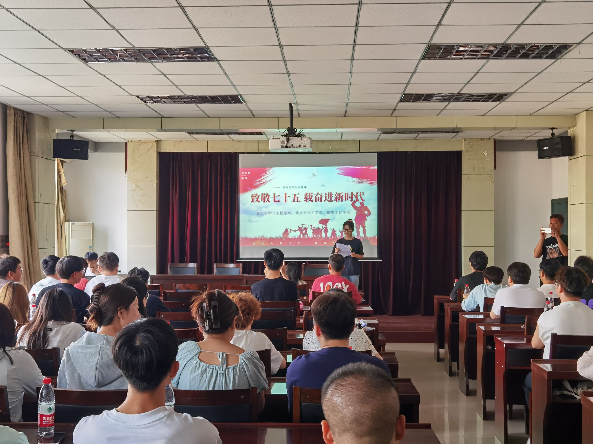 活动在庄严的国歌声中拉开序幕,全体起立,共同奏唱国歌,展现了对祖国的无限热爱和崇高敬意。同学们重温了建校历史,回顾了办学初心,陕科大在新中国建设的光辉照耀下,历经六十六年的发展,秉承“三创两迁”精神和“至诚至博”校训,从轻工业起步,发展成为多学科并进的陕西省国家“双一流”培育高校和重点建设的高水平大学,用优异的学科建设、人才培养、科学研究等成绩见证发展的历程,为学子们指引前行的方向。