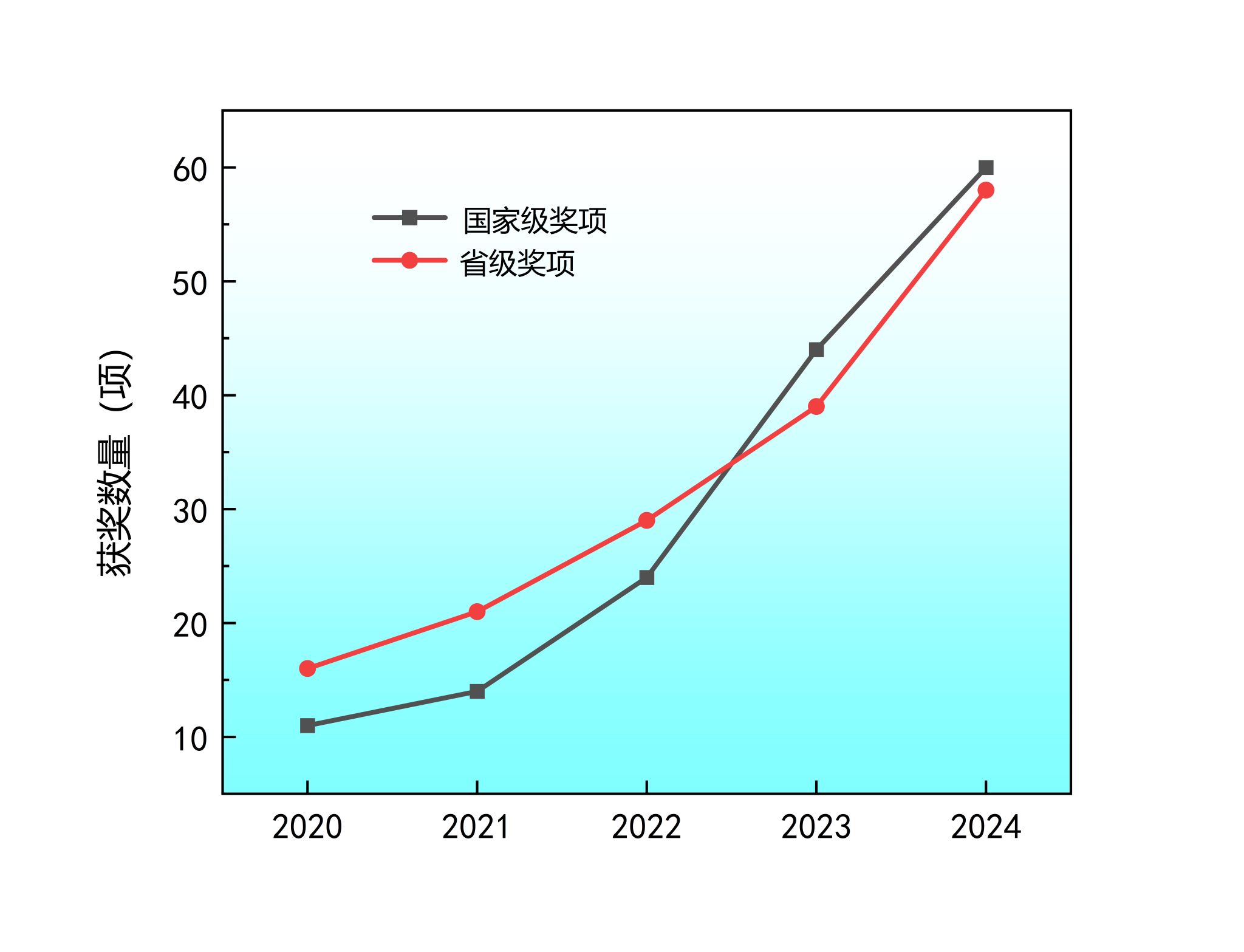 近年来,88858cc永利官网紧密围绕学校“双一流”建设目标,全面贯彻落实立德树人根本任务,根据学校第三次党代会提出的发展规划和工作部署,推动科创竞赛与科研成果转化深度融合,不断提高研究生创新能力培养质量。学院高度重视科创竞赛在研究生创新能力培养中的作用,通过优化激励机制、创新培养模式、拓宽参赛渠道等多方面举措,取得显著成果。近5年来,学院组织研究生积极参与各类重要科创赛事,累计获得国家级奖项153项、省级奖项163项。2024年,学院研究生在中国国际大学生创新大赛、“挑战杯”全国大学生系列科技学术竞赛、中国研究生创新实践系列大赛等赛事中获得国家级奖项58项、省级奖项60项,均创历史新高。
