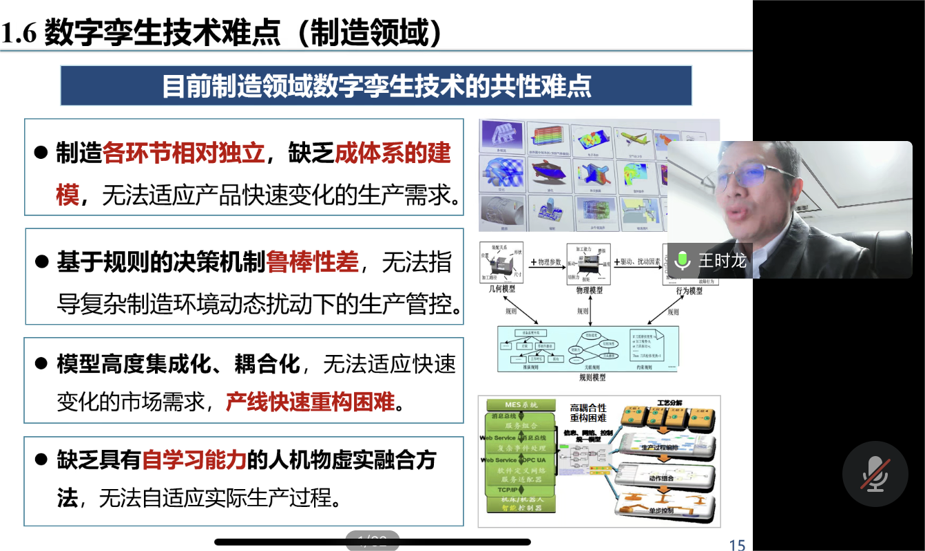 王时龙在报告中指出,智能制造是新一代人工智能技术与先进制造技术的深度融合,是新一轮工业革命的核心驱动力,而数字孪生和人机物虚实融合技术在制造领域得到了广泛应用。王时龙就数字孪生技术的定义、原型、应用、发展历程、关键技术等多个方面进行了详细的讲解。结合实际案例,针对产品订单变化、实时生产状态等,采用数字孪生和人机物虚实融合技术对自动化生产线进行自适应重构。王时龙还介绍了其团队在数字孪生方面的重大研究成果。