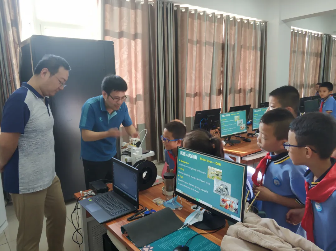 【9】2021年9月10日,恰逢教师节,机器人工程专业教师史鹏涛、刘朋、刘庆立来到陕科大附小新兴小学,开展爱“兴”机器人公益讲座活动,机器人工程专业社会服务计划正式启动,鼓励机器人工程专业学生利用课余时间服务社会,开展公益助教活动,每周一次的爱兴公益活动延续至今。