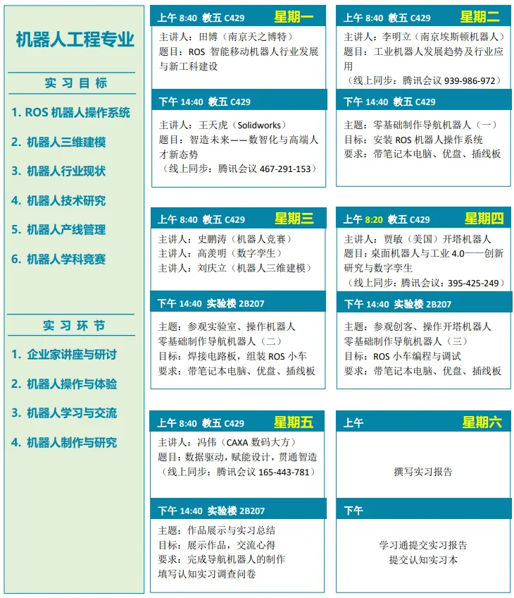 【12】2022年5月16日至20日,机器人工程专业认知实习周,因为疫情原因,按照教务处统一要求,认知实习不能到企业实地参观,机器人工程专业为学生联系了五家知名企业专家通过线上线下结合的方式讲座交流。