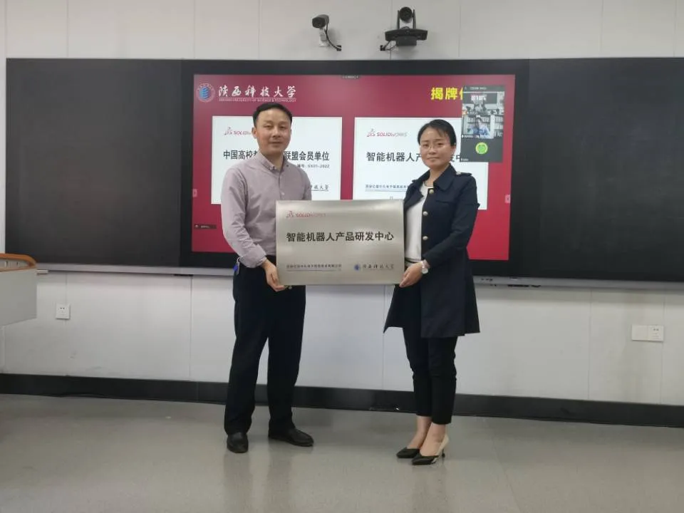 【14】2022年5月16日下午15:00,机器人工程专业认知实习活动第二场企业专题讲座,法国达索SolidWorks公司大中国区教育社群资深顾问王天虎老师做教育教学论坛报告学院特聘王天虎老师为机器人工程专业特聘教育顾问兼企业导师,聘任陈阳老师为机器人工程专业特聘企业导师,陕西科技大学成为“SolidWorks中国高校产业联盟首家会员单位”,并成立“智能机器人产品研发中心”。机器人工程正式与Solidworks建立官方校企合作关系。