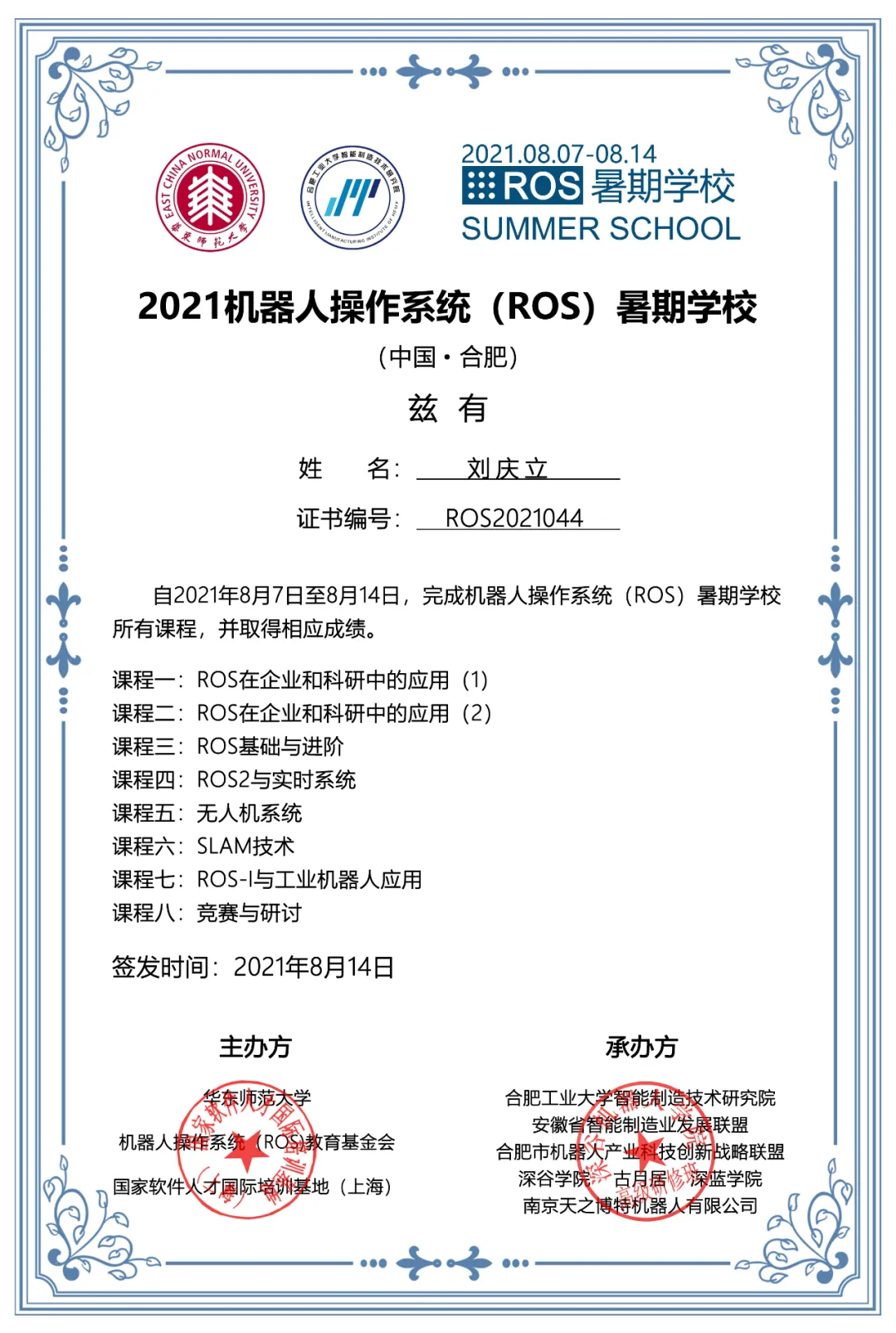 【7】2021年8月14日,我校机器人工程专业团队成员报名参加中国机器人操作系统(ROS)暑期学校培训学习,顺利完成所有课程,并获得结业证书,团队教师开始学习研究ROS机器人操作系统。