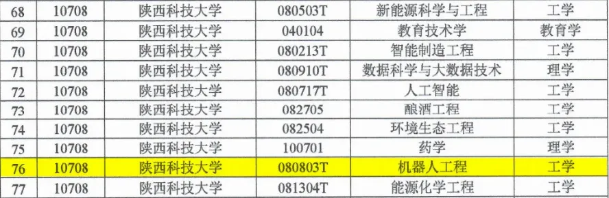 【11】2022年5月31日,陕西省学位委员会公布《关于同意增列西北大学的地质工程等279个专业为新增学士学位授权专业的批复》文件,依据《学士学位授权与授予管理办法》,经陕西省学位委员会研究,同意增列陕西科技大学机器人工程为新增学士学位授权专业。