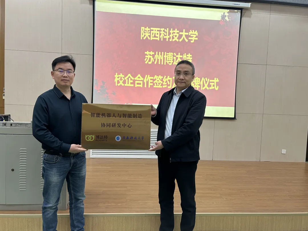 【36】2024年3月28日上午,陕西科技大学与苏州博达特机电科技有限公司签订校企合作协议,依托我校教育部GF智能制造实践基地,建立“智能机器人与智能制造协同研发中心”,共同推进机器人与智能制造领域的技术研发合作,共同致力于机器人工程相关人才的培养、交流与教学资源建设。学院聘请苏州博达特总经理浦恩帅先生为机器人工程专业特聘教育顾问兼企业导师,同时聘请销售副总屈海洋、技术专家侯东锋为机器人工程专业特聘企业导师。机器人工程与苏州博达特正式建立官方校企合作关系。