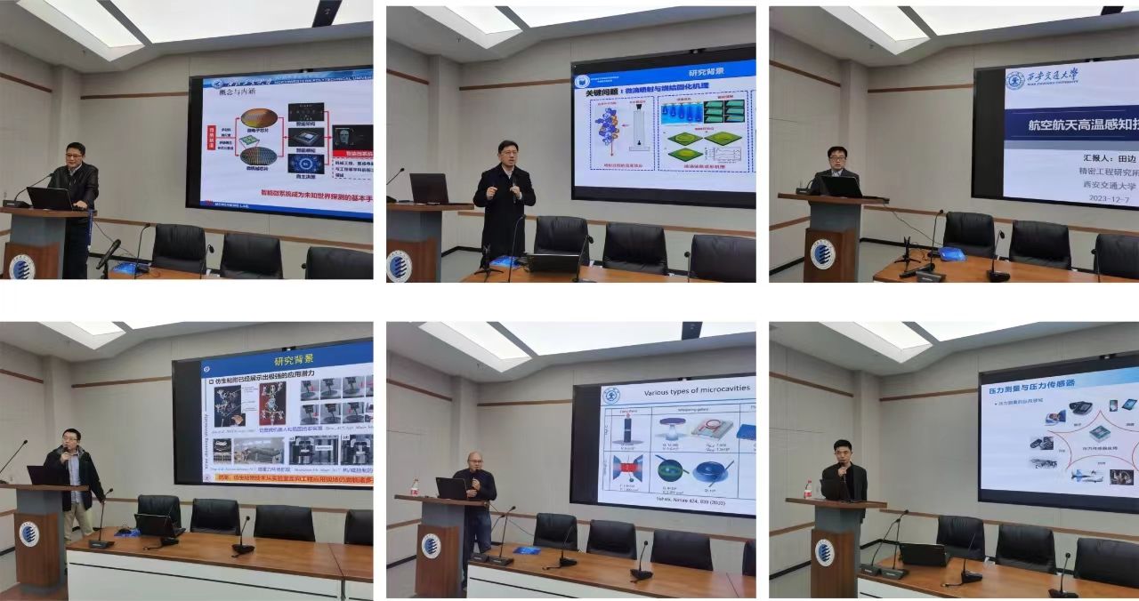 下午的3场主题报告分别由西安交通大学国家级青年人才田洪淼教授、西安交通大学宽禁带半导体与量子器件研究所副所长李峰教授、西安思微传感科技有限公司研发部部长徐林鹏高级工程师作了《微纳仿生粘附结构设计、制造及其应用》《曲面微腔光子动力学中的稳定与混沌现象》和《MEMS压力传感器核心技术应用》的主题报告。