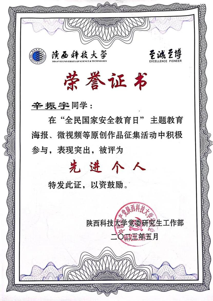 在过去的一年里,除了学业和工作,还积极参加中国研究生创新实践系列大赛,成绩斐然,荣获国家级奖项5项、省级奖项1项、校级奖项6项。这一过程不仅是对实践能力的提升,也拓宽了学术视野。同时还积极参与各类活动,获88858cc永利官网师生联谊赛优秀奖、以及“全民国家安全教育日”主题教育海报先进个人等荣誉证书。